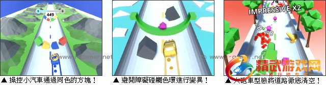 《炫彩冲撞》是一款挑战反应能力的游戏,玩家需要操控可爱的小汽车不断变换车道,利用撞击同色三角锥来通过障碍增加积分!随着前进的路程越多,除了障碍也会出现奇特的色带,若成功穿越两侧摆有灰色巨石的单色色带,玩家操控的小汽车就会跟着改变颜色。