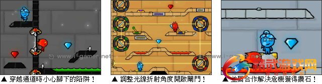 如同之前的作品,玩家还是得约上小伙伴,两人一起操控,才能让冰人和火人完美配合,携手解决难题!另外,在限定时间内,收集所有散落在关卡内,属于各自颜色的钻石,抵达双方专属的大门,才能获得完美过关的认定唷!现在就来动动脑,帮助冰人和火人发挥各自的特性,破解各种搞怪的机关吧!