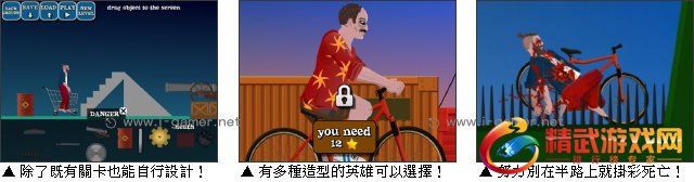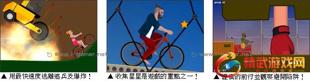 在游戏的开始,玩家需要操控主角骑上新购入的自行车,摇摇晃晃地往前移动,虽是状似悠闲的气氛,平静的道路风景,玩家可千万不要放下戒心唷!只要碰触就会引爆的地雷、钉满尖刺的木板、尖锐的锯片,各种致命的危机将随着你的前进,一一揭开它们邪恶的面纱!这并不是一个计时游戏,因此缓慢稳定的前行,才是最佳的过关守则唷!另外,随着破解的关卡越多,主角使用的交通工具也会变得多样,无论是在独轮车上保持平衡,在购物车中努力前进,观看起来都相当逗趣呢!热爱《危机》系列游戏或是心中郁闷的玩家,现在就来尝试一下吧,堆积的压力随着游戏的进行,多少都能排解一些唷!