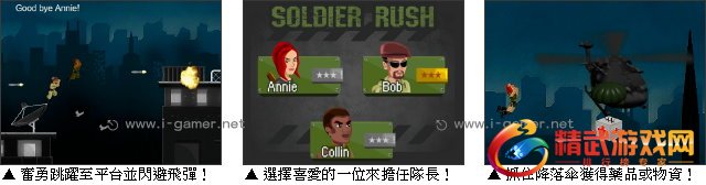 游戏中要抓準跳跃时机,是在高楼顶上疾行的重点,若没掌握好,从两栋楼中摔落,该名队员可就会瞬间和大家说再见喽,而一旦三名全数丧生,任务更会直接告终呢!另外,敌方会派出直升机试着击杀队员,除了闪避,若能抓住绑着手榴弹的降落伞,就可以瞬间将它给击毁喽!在看似无尽头的逃命路上,你们能够支撑多久呢?现在就来试试吧!