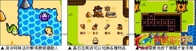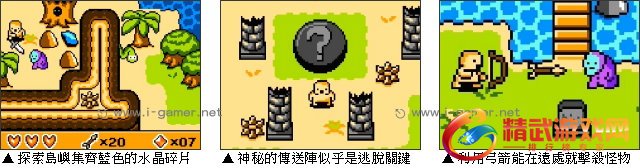在游戏中,玩家需要在找到武器前,尽可能让手无缚鸡之力的主角迴避岛上的各种生物,而在获得长剑或是弓箭后,玩家就可以依照自己的喜好,攻击这些阻挠前行的碍事家伙了!不只击杀敌对生物,将路上的杂草割除,玩家也都能随机的获得补血或是晶石奖励。只要累积一定数量,在找到商店后,就可以兑换物品甚至强化能力喽!另外,在探索时,偶而也能见到蓝色的水晶碎片,玩家可得尽力去收集唷,那很可能是解开岛屿祕密的关键呢。现在就来帮助我们倒楣的主角吧!
