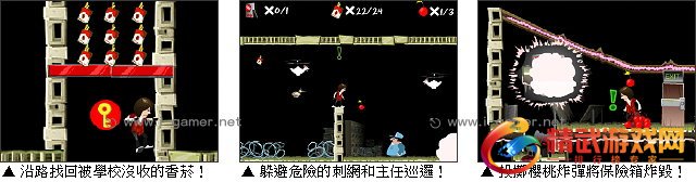 游戏操作:以键盘左右方向键移动班德,空白键跳跃, P 键暂停,F 键丢樱桃炸弹,↑、↓ 键调整投掷方向。