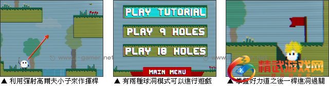 游戏操作:以滑鼠左键移动高尔夫小子,右键调整弹射力道及角度,鬆开击球。
