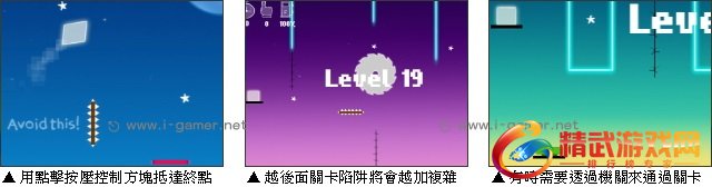 《手指方块》是一款容易上手却有点难度的游戏,游戏中玩家需要藉着点击以及长按来控制方块的跳跃以及飞行。只要将方块放置于红色平台上即可通过关卡。可别以为这很简单,关卡常常会有各种陷阱机关阻碍,而且方块只能往右上飞行,若是飞过头又没有机关协助,那可是没办法回头的唷!