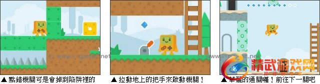 游戏中还有许多机关伴随着陷阱,一个不小心动到机关可是会掉进陷阱里的呢!要怎么安全的通过陷阱同时启动机关来畅通道路,也是一门深奥的学问呢。有些地方甚至是要拖动机关来破坏障碍物的呢,好好的运用关卡里的各种物品来获得迈向下一关卡的资格!