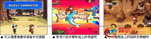 游戏中玩家可以选择两只角色,分别是梅宝以及迪普,玩家可以自由挑选人物。两只角色各有不同的特色攻击,以及让人讚不绝口的华丽大绝招。关卡有时会有可以打破的树木或是箱子,打破它来获得道具吧!若是捡到扫把可以使用它来攻击敌人,但要注意的是,扫把也是会坏掉的喔!有时还会捡到一些小道具可以向敌人的方向丢出去。快一起来帮助神秘小镇恢复到本来的平静生活吧!