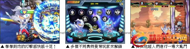 身受玩家喜爱的《超奥特曼联盟》出三代啰!喜欢鹹蛋超人的老玩家或者是老影迷们还在等什么呢?快来打败那些宇宙怪兽吧!超奥特曼联盟是一款改编鹹蛋超人的动作过关游戏,玩家可以从选择自己喜欢的奥特曼来进行战斗。