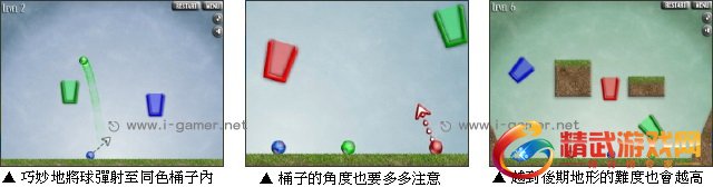 游戏操作:以滑鼠操作进行游戏,点击、拖曳拉动弹射路径与力道。