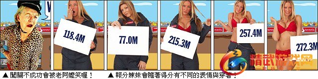 Digforfire 创作的一款搞笑趣味游戏,玩家必须骑特技摩托车高空越过八台并排的大巴士,飞行距离越远则分数越高,报成绩的美女穿着越火辣,闯关不成功会被老阿嬷笑喔 ... 呵呵!