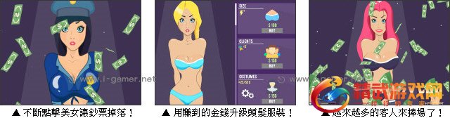 夜店是男人的最佳娱乐场所,可以看到许多美女在舞台上随着音乐摆动,为了赚小费她们穿着的也很清凉。游戏中玩家要不断的点击美女让大把钞票掉落,利用这些资金购买新的衣服与更换髮型,经由不断的升级让美女挣得更多金钱,玩家们快拿起酒杯享受这场秀吧!