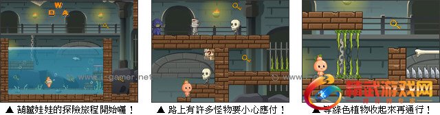 葫芦娃娃发现一张藏宝地图,决定到宝藏所在地一探究竟,但里头充满可怕的骷髅与木乃伊,我们来帮他突破难关吧。游戏中玩家要收集所有的钥匙才能打开宝藏,遇到困难时可以撞破问号盒取得道具来扫除障碍,快带着葫芦娃娃踏上掘金之旅吧!