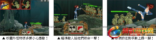 女学生在上学的途中为了抄近路不顾朋友劝说走到了有怪物的森林里,现在她被怪物包围了,幸亏她会功夫,来帮她杀出重围吧。游戏中打败兽人会掉钱或是补血道具,利用金钱升级装备来闯关。喜欢打斗游戏的朋友赶快来挑战看看吧!