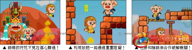 唐僧準备用来对付牛魔王的五种道符不见了,心急的唐僧非常难过,为了安慰师傅,悟空和八戒将进行一场冒险旅程。游戏中到处都潜伏着危险的陷阱和恐怖的怪物,师兄弟俩人将越过重重的难关与陷阱,并联手触发机关来蒐集道符。快来帮助悟空与八戒通过关卡吧。