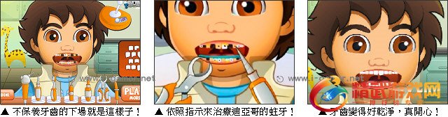 爱探险的迪亚哥经常在外面探险,无法定期刷牙导致满嘴的蛀牙与汙垢,经常被牙痛折磨到受不了,朵拉硬着头皮把他带来看牙医。玩家要根据牙齿的状况来处理,首先清洗充满汙垢的牙齿,在使用各式各样的工具依序治疗,最后把坏掉的牙齿拔掉,换上完整的假牙就大功告成了。现在我们一起帮迪亚哥恢复健康的牙齿吧!