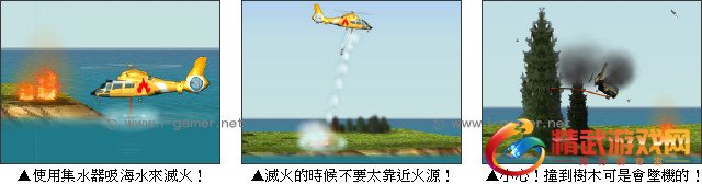 消防航空技术的核心装备就是直升机。由于直升机具备有垂直升降及空中悬庭的独特性能,所以非常适合用来做消防任务,因此各国开始致力于发展救灾用直升机。游戏中,玩家将扮演一名直升机驾驶,你必须操控直升机移动到水源地吸取海水,然后飞往火源点上方进行灭火的动作。在救灾中,要注意到不要撞到树木,或是离火源太近,这些都是会导致坠机的。