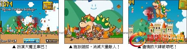 玛莉欧世界的大魔王库巴终于受够了玛莉欧时常欺侮他的喽啰们,因此他决定亲自出马来到了玛莉欧王国大肆破坏一番。玩家将扮演背壳上长满尖刺的库巴来痛扁王国内的玛莉欧居民和摧毁每一栋城堡,同时可以将玛莉欧们抓起来甩上天或是对着他们吐火喔!快来玛莉欧的世界大肆破坏吧!