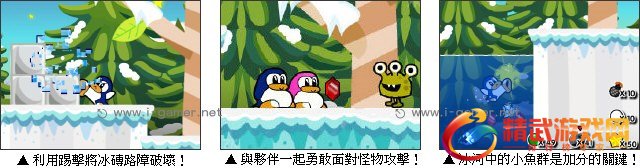 这次小企鹅发现了一个新大陆,大陆上困难重重,为了填饱肚子,牠甘愿冒险前往寻找最爱的食物!玩家在游戏中,要利用小企鹅的各种炸弹与前踢,闯过新大陆上的各种全新关卡,过关所需要的星星与小鱼,都藏在不明显的地方!玩家要仔细的观察路过的每个角落,替小企鹅找到最爱吃的,新鲜小鱼来填饱肚子。