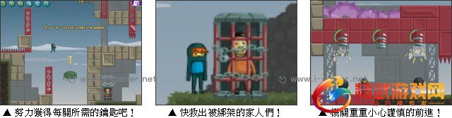 游戏操作:以键盘 A、D 键或左右方向键操作移动,上方向键与 W 键跳跃,下方向键与 S 键配合方向键为向该方向翻滚,R 键重玩,P 键暂停。
