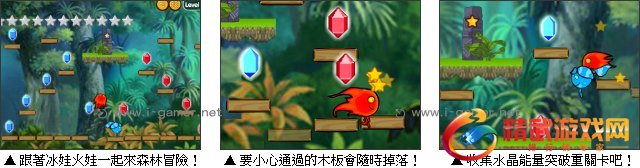 冰娃火娃要到森林里收集能量了,这次的旅途又会发生什么惊险有趣的故事呢?游戏中要小心走过的木板会随时掉落,必须要两人配合收集完所有的水晶能量才能通过层层关卡喔。游戏共有 20 道关卡等你来挑战,就让我们跟着冰娃火娃一同前往冒险吧!
