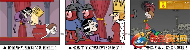 游戏中玩家将扮演一位刺客,主要任务是要刺杀国王,并将王位占为己有,你要悄悄地潜伏在国王身后,趁他不注意的时候刺杀他,当你刺杀成功,成为国王时,你的身后也会有许多人想刺杀你,一定要随时保持警戒。每个刺杀者最后都有不同的结局,赶紧一起进入游戏看看你能玩出几种呢!