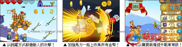 这是两个国王之间的战争,为了要夺回属于自己的国土,国王必须越过士兵的堵截,摧毁敌人的城堡。沿路除了收集金币来升级战车外,还要随时注意路上的障碍物及怪物,在适当时机进行发动攻击,尽快的抵达终点。快来消灭掉敌方士兵,帮助国王完成进击吧!