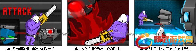 好久不见的紫色恐怖游戏推出新作啰!在未来的世界里,机器人的暴动成了现实。玩家必须操作主角挥舞着巨大电锯,和邪恶的机器人做斗争,每个关卡后面都有一个大魔王,要小心他们的攻击,不然失败可是要从头开始喔。现在就一起跟着紫色恐怖使用电锯大搞破坏吧!