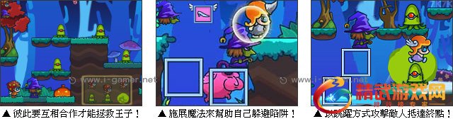 游戏操作:玩家 1 - 以键盘 A、D 键操作巫师移动,W 键跳跃,S 键施展魔法。玩家 2 - 以键盘左右方向键操作灰姑娘移动,上键跳跃。
