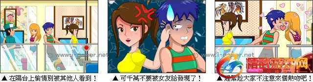 男孩与隔壁女孩日久生情,男孩忍不住想要在阳台上亲吻对方,不过亲吻还是要分场合的喔。游戏中玩家要帮助男女主角偷偷接吻,不过千万不能被邻居的老奶奶及打扫的清洁工看到,不然可就糟糕了,另外,还要在有限的时间内完成才能顺利过关喔,喜欢挑战刺激的玩家快来试试看吧!