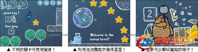 游戏操作:以键盘左右方向键操作角色移动,上键跳跃,数字键 1-3 切换角色,R 键重玩。提示:蓝兔可以二段跳跃,澄象可以敲碎物品,绿鼠可以爬树和吃掉乳酪。