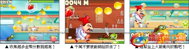 可怜的小乌龟被人抓到锅里去炖汤了,可机智的它并不甘就此结束自己的生命,牠要趁着厨师不注意的时候偷跑出来,为了不要再被厨师给抓到,必须赶紧想办法逃离这里,可是想要逃离这里可没那么简单,沿路上必须躲避厨师的追捕之外,还要随时注意路上的障碍物,要小心不能被绊倒了喔。大家快来一起帮助可怜的小乌龟成功逃离厨师的追杀!