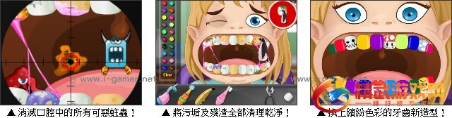 游戏操作:以滑鼠操作进行游戏,点击道具为女孩治疗牙齿。