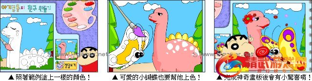 蜡笔小新带着神奇的画板来啰,这可不是一般普通的涂鸦板,它拥有不可思议的魔力,只要依照着旁边的範例图片,从调色盘选择正确的颜色涂上,涂鸦里的动物及昆虫就会动起来唷。赶快来试试小新的神奇画板,看看最后会出现什么样的画面!
