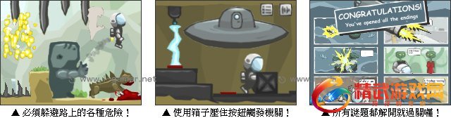 宇航员的太空船在外太空航行,突然被一股神秘的力量给吸到一个不知名的星球,飞船在坠落时摔毁了,要在这里寻找出口才能回家。这个星球似乎充满着许多怪异的谜团,究竟是个怎样的冒险,还是梦境呢?大家快来帮忙完成冒险吧!