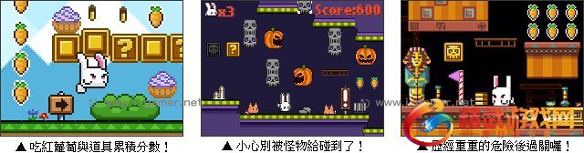 可爱的玛莉兔看了玛莉欧的英勇事蹟也决定到外面的世界闯一闯,虽然在玛莉兔的世界里没有那么多的怪物,但是能欺负牠的小动物也是不少。游戏中玩家需要沿路收集红萝蔔并可吃道具长大,还要躲开怪物的攻击,另外还有三种不同的场景关卡可以选择,现在就马上进入游戏挑战看看吧!