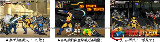 游戏操作:以键盘左右方向键操作金刚狼左右移动,上键跳跃,下键下蹲,Z 键出拳,X 键轻脚,空白键必杀。