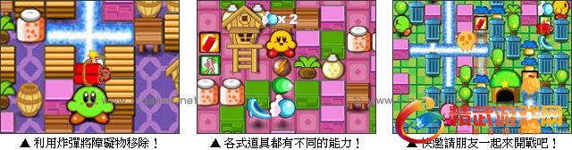 星之卡比系列之泡泡堂登场了,这次星之卡比还带来了另外的三个小伙伴,準备要来一场好玩又刺激的泡泡大战。游戏玩法与炸弹超人类似,利用炸弹将障碍物移除,并可吃道具让自己的攻击能力提升,击败对手就可以获得胜利。赶快来试试看,还可以找朋友一起对战唷!