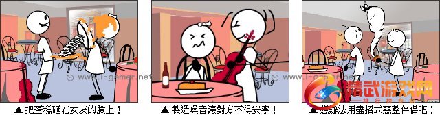火柴人和她的女友在餐厅里等上菜等的太无聊了,决定使出各种花招恶整对方,来消磨无趣的等待时间。玩家可以使用餐厅里的各种设备,来对另一半进行恶搞,每样物品会发生的事情和效果都不同,赶快来试试有哪些整人的招式吧!