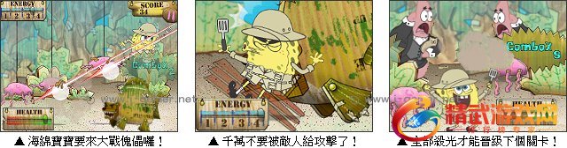 游戏操作:拖动滑鼠削怪物让海绵宝宝进行铲子攻击(有能量限制一直使用会体力不支)。
