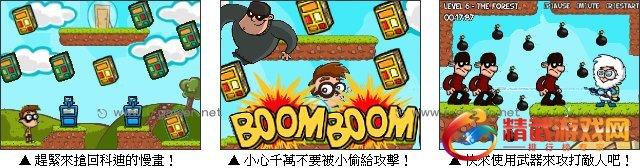 1. 以键盘左右键操作人物移动,上键跳跃,下键进门,空白键发动超人技能 (需将漫画书收集齐全)。