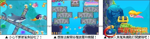 游戏操作:以键盘方向键操作美人鱼移动,收集足够的金币可以前往主功能表购买更好的鱼尾。