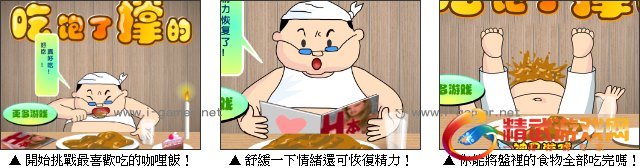 吃饱了撑的是一款搞怪另类的小游戏,游戏中的胖子为了抢夺大胃王的称号,必须想办法将最喜欢吃的咖哩饭全部吃完,但是咖哩饭的份量奇大无比,你只有一杯水、一本杂誌和一个甜点,可以让你舒缓一下味觉,到底该如何才能把食物通通吃完呢?快来动动脑帮帮他吧!