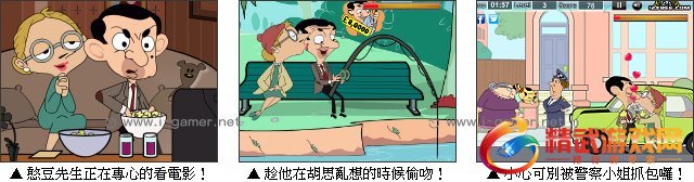 豆豆先生实在是又搞笑又可爱,不要看他不起眼的长相,他可是很受欢迎的喔!游戏中的女士就是其中一位爱慕豆豆先生的人,玩家要趁豆豆先生做白日梦时偷亲他,并且累积右上方的能量表,以获得高分,但是要小心别被他给发现了喔!