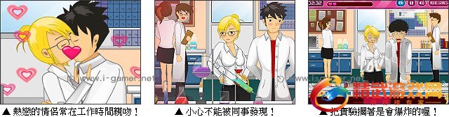 一对热恋中的情侣,他们都是实验室的工作人员,虽然是工作时间,他们还是忍不住要亲吻对方。不过要小心不要被其他同事看到,同时还要能有效率的进行实验喔,当小球滑动到红色区域,就代表该做实验了。你能在谈恋爱时顺便做好工作吗?快来挑战看看吧!