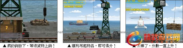 游戏操作:以滑鼠操作进行游戏,点击左键吊起货物(放下钩子放下一段时间后钩子会自动收起)。