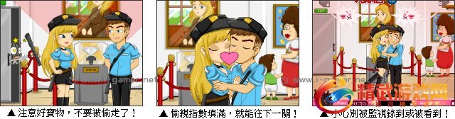 一对甜蜜的保安情侣,负责看守博物馆今天展出的钻石。他们要留意别让宝石给偷走,还要在不被发现的情况下,跟男朋友甜蜜的亲吻。就让我们一起来看看恩爱的她们如何一起看守博物馆,不被小偷做乱吧!