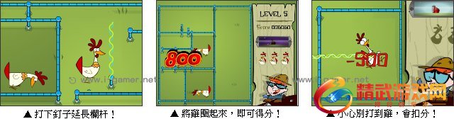 游戏操作:以滑鼠操作进行游戏,选择合适的地方打下钉子,按住左键不放拖动即可发射栏杆。
