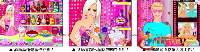 芭比和男朋友一起参加鸡尾酒会,芭比突发奇想要男友喝她自己调配的鸡尾酒。将不同酒类、材料加入,混合,摇晃后调配出美味的鸡尾酒。不过要小心,鸡尾酒可能会变成爱情毒药哦!