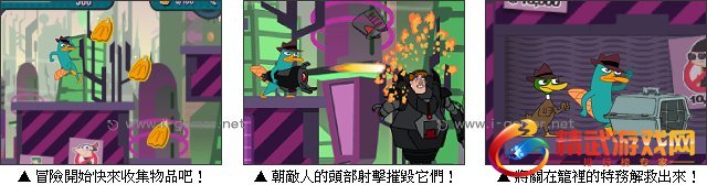 游戏中泰瑞要前往实验室的深处阻止博士的计画,沿途要收齐点数、拯救被关在笼子里的特务,被解救出来的特务会帮忙打开通道,当通道开启后就能挑战超时空终结者。最终泰瑞能成功击垮邪恶博士的野心吗?快来与鸭嘴兽泰瑞一起来拯救世界吧!