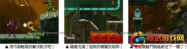 游戏操作:以键盘左右方向键操作移动,上键跳跃 ( 可进行二段跳,配合左右方向键可在墙上连跳),下键蹲,←/→ +↓键捲缩滚动,空白键射击 ( 按住可蓄力 ),Esc 键暂停游戏。