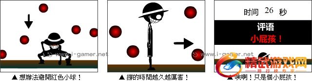 游戏操作:以滑鼠操作主角移动,点击右键可以下蹲,避开红色小球。